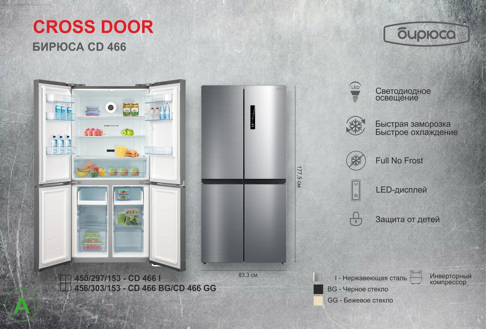 Новые модели вместительнее стандартных холодильников: полезный объём Бирюса SBS 587 составляет 510 литров (335+175), у модели Бирюса CD 466 полезный объём составляет 456 литров (303+153). Холодильники Бирюса SBS 587 имеют вертикальное расположение камер, в холодильниках Бирюса CD 466 камеры расположены горизонтально с 4мя дверьми, которые можно открывать независимо друг от друга.